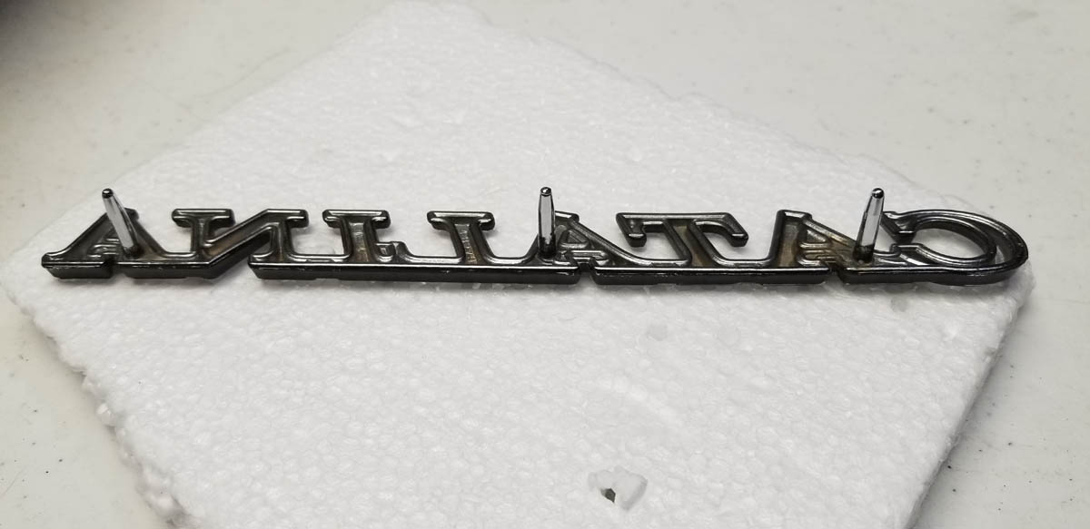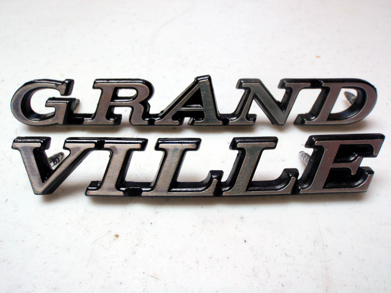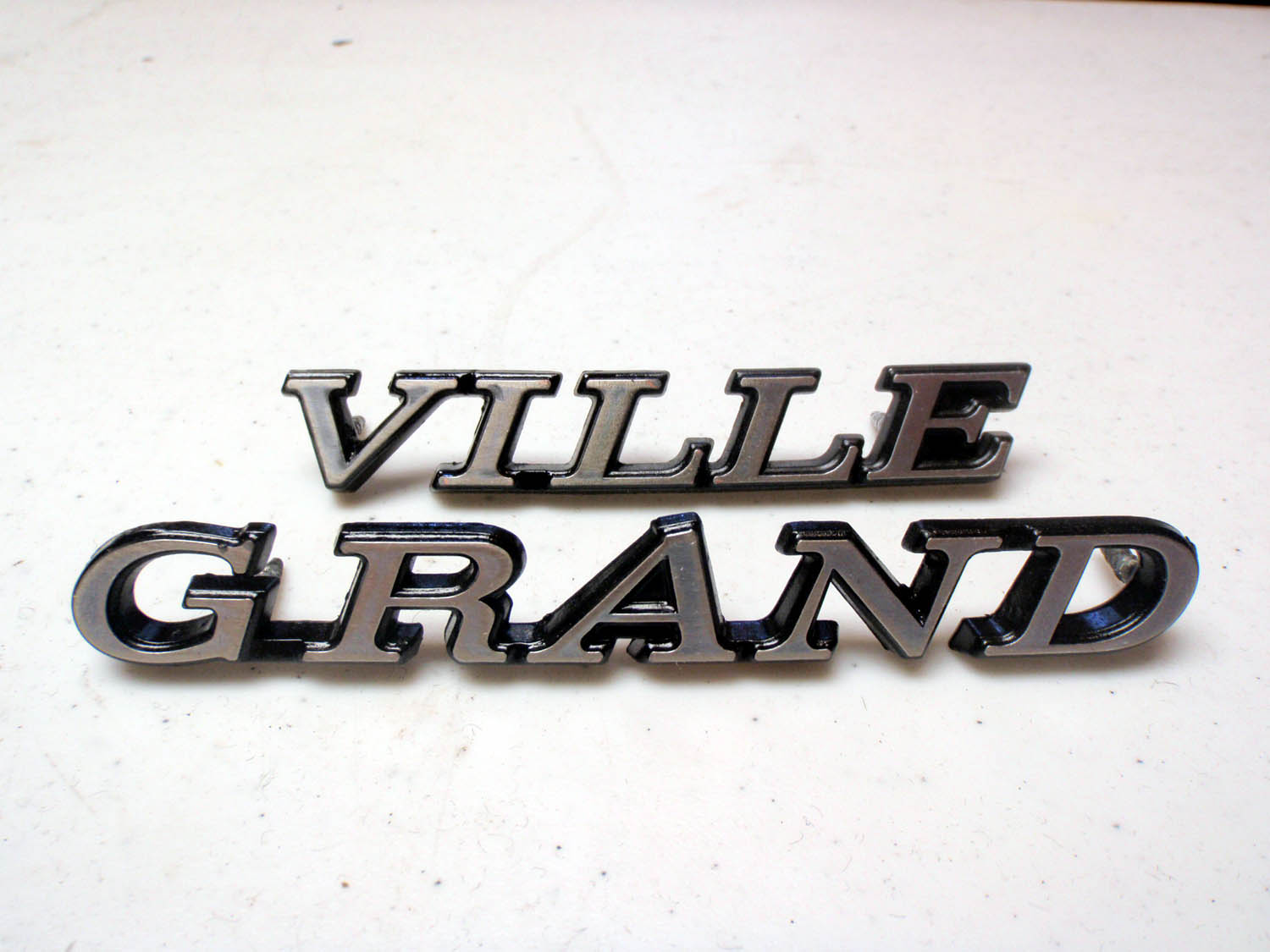 Professionally restored fender emblem nameplates, "GRAND" and "VILLE".